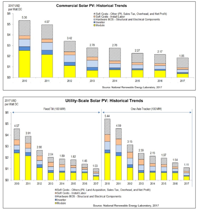 No, but some projects will feel the impact more than others. It will take some time for the industry to parse the impacts of the Solar Tariff, but let's first put this into context. NREL reports that solar modules account for 19% (for commercial solar) to 33% (for utility-scale solar) of the installed cost of a solar PV system. So the Solar Tariff represents an increase of 6% to 11% of total installed system cost. In real dollars, the 30% Solar Tariff will immediately add between 10.5 cents/watt and 11.4 cents/watt to module costs (assuming module prices otherwise stay at Q1 2017 levels). By comparison, NREL reports that the installed cost of commercial solar fell 32 cents/watt between Q1 2016 and Q1 2017, and over 40 cents/watt for utility-scale solar during that same period.