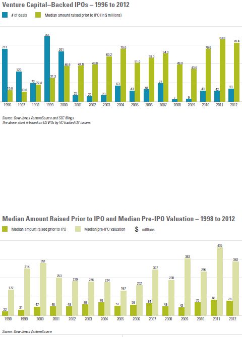 The IPO market remained receptive to VC-backed companies in 2012, continuing the recovery that began in 2010 after VC-backed IPOs all but disappeared for most of 2008 and 2009. A total of 51 US venture-backed companies went public in the United States in 2012, up from 42 IPOs in the prior year. The largest VC-backed IPO of 2012 was the $16.0 billion offering by Facebook. The median amount of time from initial funding to an IPO increased from 6.4 years in 2011 to 7.4 years in 2012.
