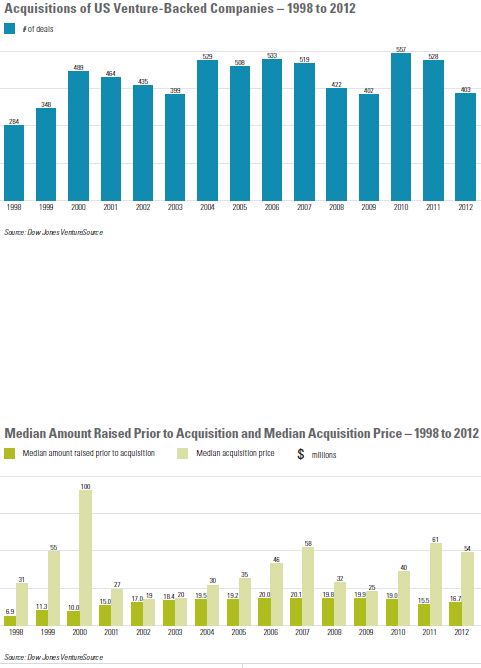 The ratio of median acquisition price to median amount raised prior to acquisition decreased from 3.9:1 in 2011 to 3.2:1 in 2012 (a higher ratio means higher returns to pre-acquisition investors). The decline reflects a combination of higher investment levels prior to acquisition and lower sale valuations. Apart from 2011, this ratio in 2012 was the highest since 2000's ratio of 10.0:1 at the apex of the dot-com delirium.