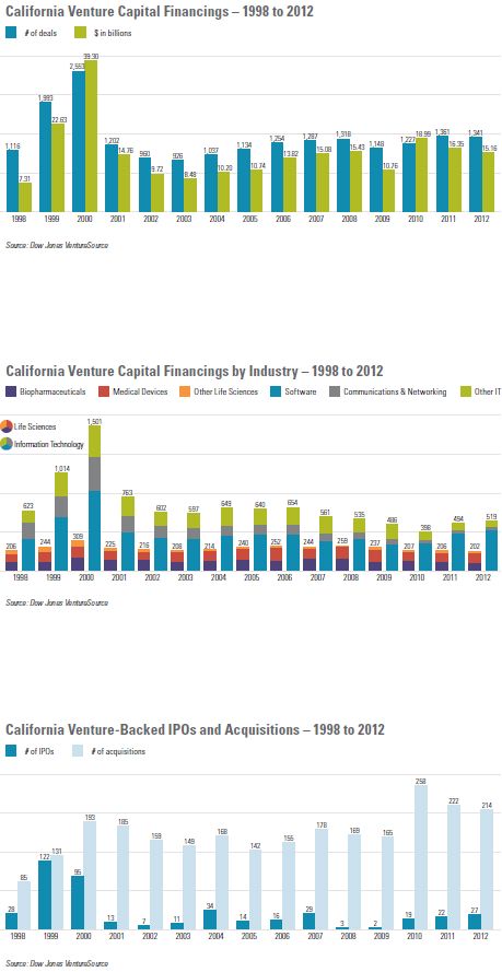 While combined IPO and M&A exits in 2012 lagged behind the preceding two years, liquidity events for California VC-backed companies remained well above those of any other year, with the exception of 1999 (when IPOs peaked at 122) and 2000 (when acquisitions peaked at 193).