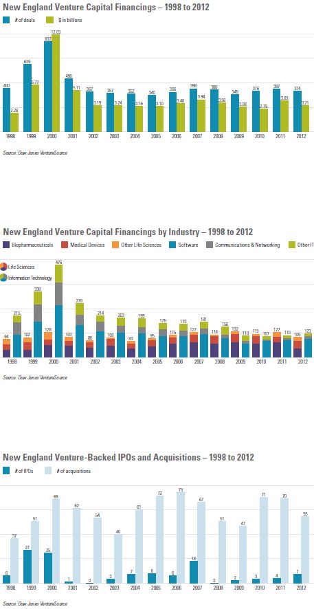 New England generated seven venture-backed IPOs in 2012—six from Massachusetts and one from Connecticut—compared to four in 2011. The largest New England VC-backed IPOs were by Merrimack Pharmaceuticals ($101.1 million), KAYAK Software ($94.0 million) and Demandware ($88.0 million).