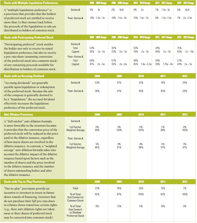Based on hundreds of venture capital financing transactions we handled from 2008 to 2012 for companies and venture capitalists in the United States and Europe, we have compiled the following deal data: