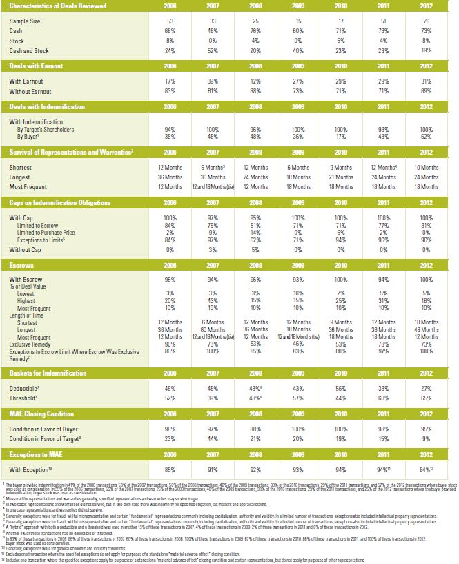 We reviewed all merger transactions between 2006 and 2012 involving venture-backed targets (as reported in Dow Jones VentureSource) in which the merger documentation was publicly available and the deal value was $25 million or more. Based on this review, we have compiled the following deal data: