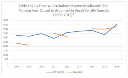 In Table 187 below, we show the year-by-year data for lag times in death penalty appeals from the appointment of capital counsel to oral arguments, divided between affirmances and reversals for the years 2008 through 2016. The data on reversals is fragmentary because outright reversals (including the penalty) are rare in death penalty cases. In 2008 and 2009, affirmances took far longer than reversals did – 3,262.54 (affirmances) to 2,373 days (reversals) in 2008, and 3,186.78 (affirmances) to 2,136.5 (reversals) in 2009. No death penalties were reversed in 2010, and affirmances averaged 3,472.75 days. In 2011, the relationship between results and lag time reversed – affirmances averaged 2,927.76 days, while reversals averaged 3,505 days. But the following year, affirmances averaged 3,591.1 days to 3,149.25 days for reversals.