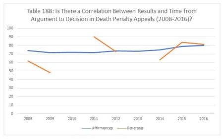 In 2013, again there were no death penalty reversals. Affirmances averaged 3,760.06 days. In 2014, affirmances averaged 3,845.38 days, while reversals averaged 4,042 days. Reversals again took longer in 2015 – 3.994 days for reversals to 3,375.79 days for affirmances. Last year, all death penalty appeals took longer from counsel to argument, regardless of the result – affirmances averaged 4,571.22 days, while reversals averaged 4,269.33 days.
