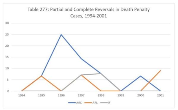 In Table 277, we report the results for the same years, divided into affirmances, partial reversals with the death penalty left in place, partial reversals with the death penalty vacated, and complete reversals. In 1994, the Court affirmed in 100% of its death penalty cases. In 1995, the Court affirmed in 86.67% of cases, partially reversed with the death penalty intact in 6.67%, and partially reversed with the death penalty vacated in the same fraction.