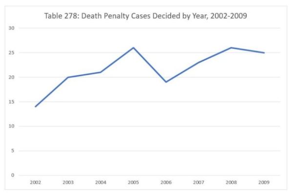 In Table 278, we report the number of death penalty appeals, year by year, for the next eight years. In 2002, the Court decided fourteen death penalty appeals. Each year following, the number increased – twenty decisions in 2003, 21 in 2004 and 26 in 2005. The Court decided nineteen death penalty appeals in 2006, 23 in 2007, 26 in 2008 and 25 in 2009.