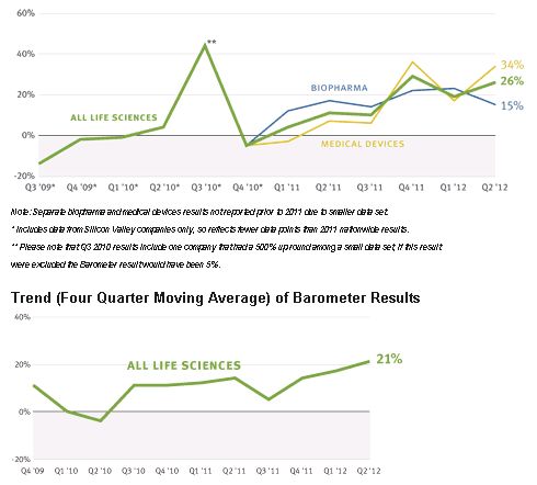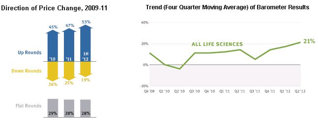 - The Fenwick & West Life Science Venture Capital Barometer") showed average round-to-round price increases of 19% for Q1 of 2012 and 26% for Q2 of 2012. For comparison, Barometer results for Q1 and Q2 of 2011 were 4% and 11%, respectively. Barometer results have continued to trend upward modestly from 2010 levels, with the four quarter moving average as of Q2 of 2012 rising to 21%.