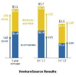 According to Dow Jones VentureSource ("VentureSource"), equity investments in U.S. venture-backed life science companies totaled $2.5 billion across 246 deals during 1H 2012, a 34% decrease in dollars and 20% decrease in deals in comparison to 1H 2011. Within the life science sector, biopharmaceutical investments were off 46% in dollars and 28% in number of deals during 1H 2012 in comparison to 1H 2011, whereas medical device investments were off 20% in dollars and 12% in number of deals.