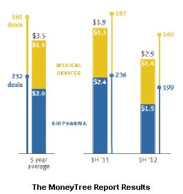 The PwC/NVCA MoneyTree Report based on data from Thomson Reuters ("The MoneyTree Report") showed generally similar results, reporting that investments in venture-backed life science companies totaled $2.9 billion across 359 deals in 1H 2012, a 25% decrease in dollars and a 15% decrease in deals in comparison to 1H 2011. The MoneyTree Report also showed a more pronounced decrease in biotechnology investments, which were reported to be off 35% in dollars and 16% in number of deals during 1H 2012, as compared to medical device investments which were off 9% in dollars and 14% in number of deals. |
