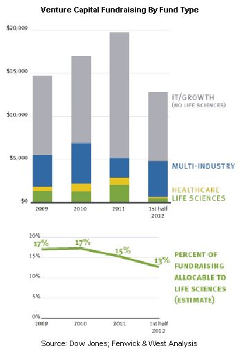 In contrast, however, our analysis of the underlying data from Dow Jones indicates that the proportion of fundraising accounted for by funds that focus primarily on healthcare or life science investing has decreased, going from 14% in 2011 to 6% in 1H 2012. Furthermore, we estimate, based on the methodology described below, that only 13% of the funds raised in 1H 2012 are likely to be allocated to life science investment, in comparison to 15% of 2011 funds and 17% of 2010 and 2009 funds.