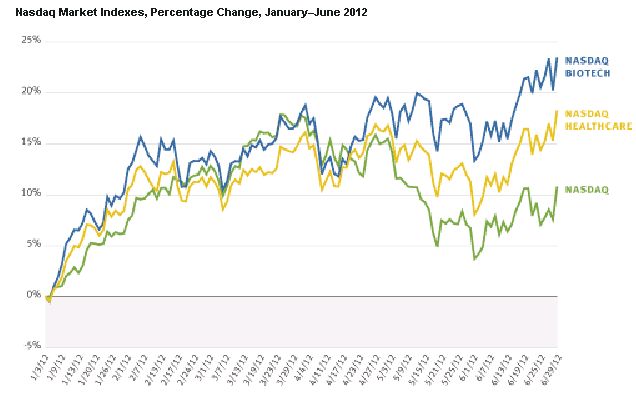 In the Nasdaq public markets, life science stocks out-performed the broader market index during 1H 2012. The Nasdaq Composite (IXIC) increased 10.8% during 1H 2012. In comparison, the Nasdaq Biotech Index (NBI) increased 23.5% during 1H 2012, and the broader Nasdaq Healthcare Index (IXHC) increased 18.3%.