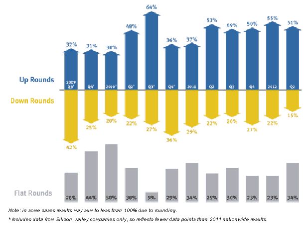 - During the first half of 2012, up rounds outpaced down rounds 53% to 19%, with 28% of rounds flat. This represents a modest improvement over results from 2011, which averaged 47% up rounds and 25% down rounds.