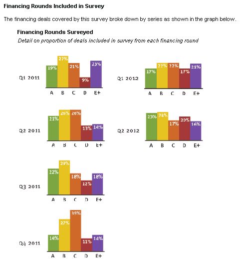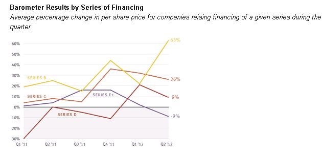 The Fenwick & West Life Science Venture Capital Barometer") it showed average round-to-round price increases of 19% for Q1 of 2012 and 26% for Q2 of 2012, which represents an improvement over results from Q1 and Q2 of 2011. Barometer results for Series B financings were noticeably higher during Q2 of 2012 at 63%.