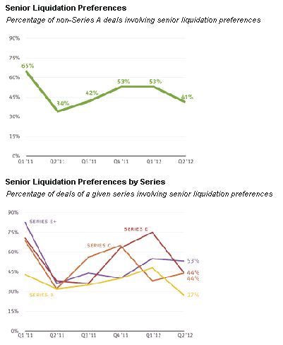 - Data on first half of 2012 financing terms show a substantial use of senior liquidation preferences, which appear in 47% of all rounds and a majority of Series D and higher rounds. Participating liquidation preferences are also common, appearing in majority of all rounds, and uncapped in approximately two-thirds of the cases.