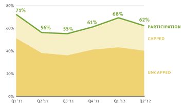 The following graph shows the percentage of deals involving participation rights. The color bands indicate the proportion of participation right deals in which the participation rights were capped (i.e., limited to a specific multiple of liquidation preferences or other amount) and uncapped.