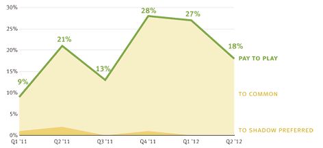 The following graph shows the percentage of deals involving pay-to-play provisions. The color bands indicate the proportion of pay-to-play provisions that involve conversion to common stock and shadow preferred stock.