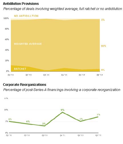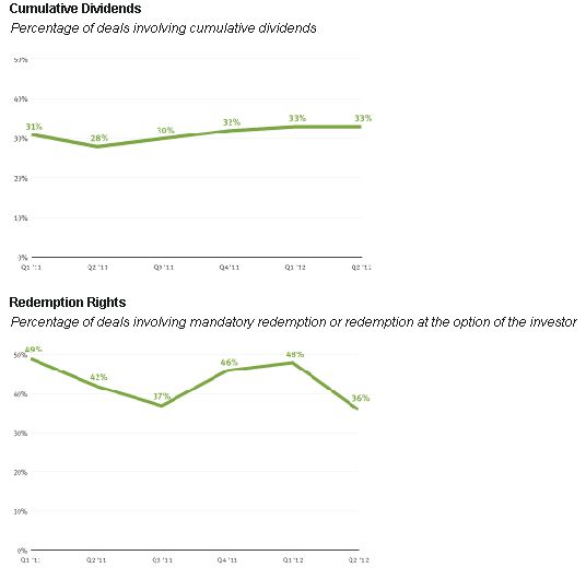 Cumulative dividends and redemption rights appeared in an average of 33% and 42%, respectively, of life science deals during 1H 2012. Anti-dilution provisions were predominantly weighted average.
