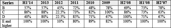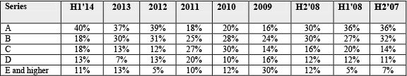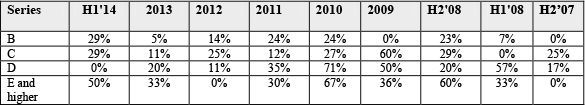 Financing Round —The financings closed in H1 2014 and in the periods covered by our previous surveys may be broken down by types of round, or series, as follows: